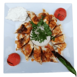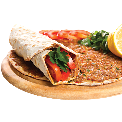 Brochette de viande hachée fromage enroulé dans une galette, yaourt à l’ail, sauce tomates