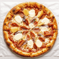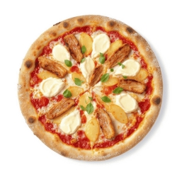 Sauce tomate ou Crème fraîche, mozzarella, thon, oignons, olives