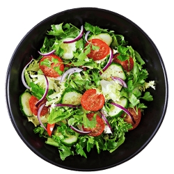 Salade, tomate, carottes, oignons, poivrons vert, riz, frites, pain fait maison
